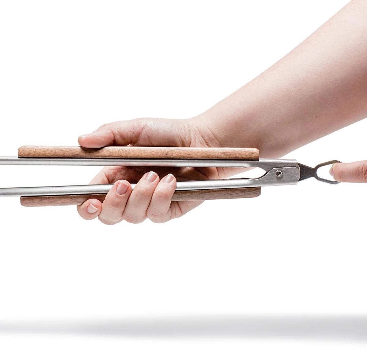 Die Grill- und Kohlenzange aus gebürstetem Edelstahl mit edlem Holzgriff ist ideal zum Grillen und Draußenkochen. Der gewölbte Zangenkopf sorgt für ein einfaches Greifen und wunschgemäßes Platzieren von Grillgut, Kohlen und Briketts. Der praktische Verschlussmechanismus ermöglicht die platzsparende Aufbewahrung der Zange. Dank der zusätzlichen Öse kann sie auch in Schrank oder an einem Haken aufgehängt werden.