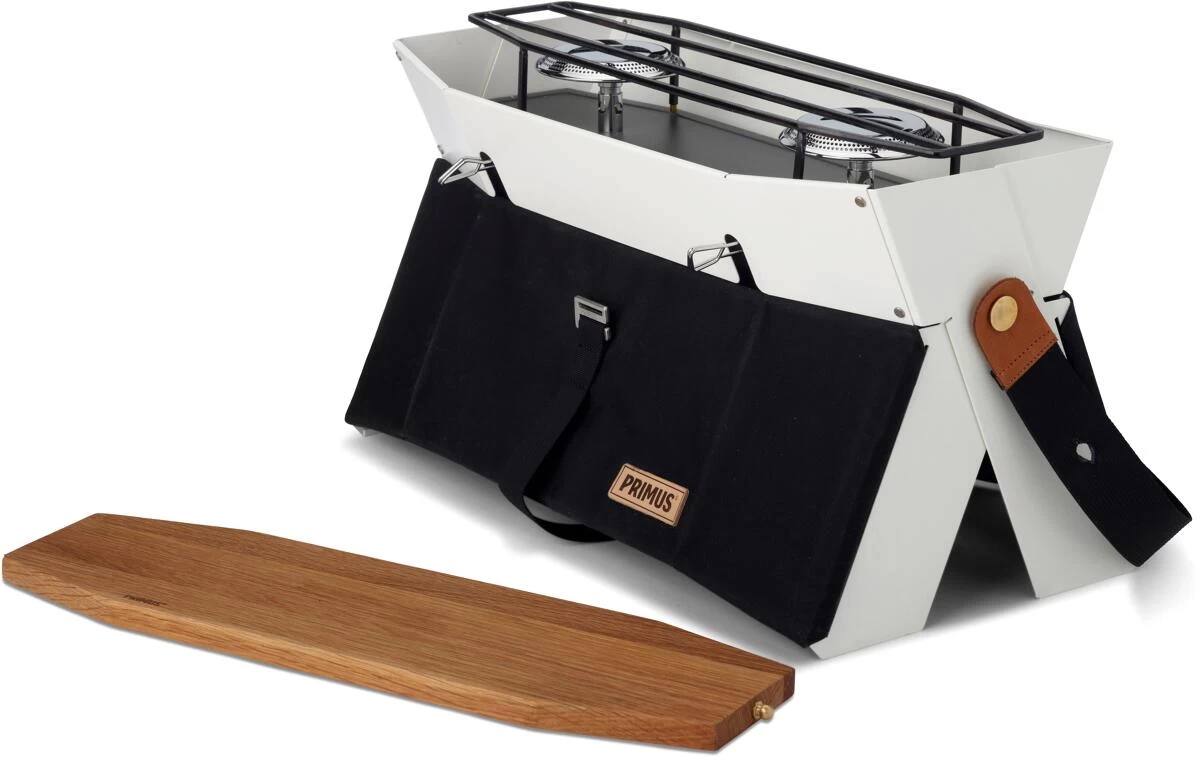 Der ‚Onja‘ ist ein sehr kompakter und moderner Kocher mit zwei Brennern. Dank des Umhängegurtes lässt er sich leicht transportieren und funktioniert auf einem Ausflug in der Stadt ebenso gut wie an einem Wochenende mit dem Kajak. Im ausgezogenen Zustand bildet das Gehäuse eine solide Kochstelle und schützt die Brenner vor Luftzug. Die Oberseite verfügt über eine Abdeckung aus Eichenholz, die sich zusätzlich als Schneidebrett oder Servierplatte verwenden lässt.