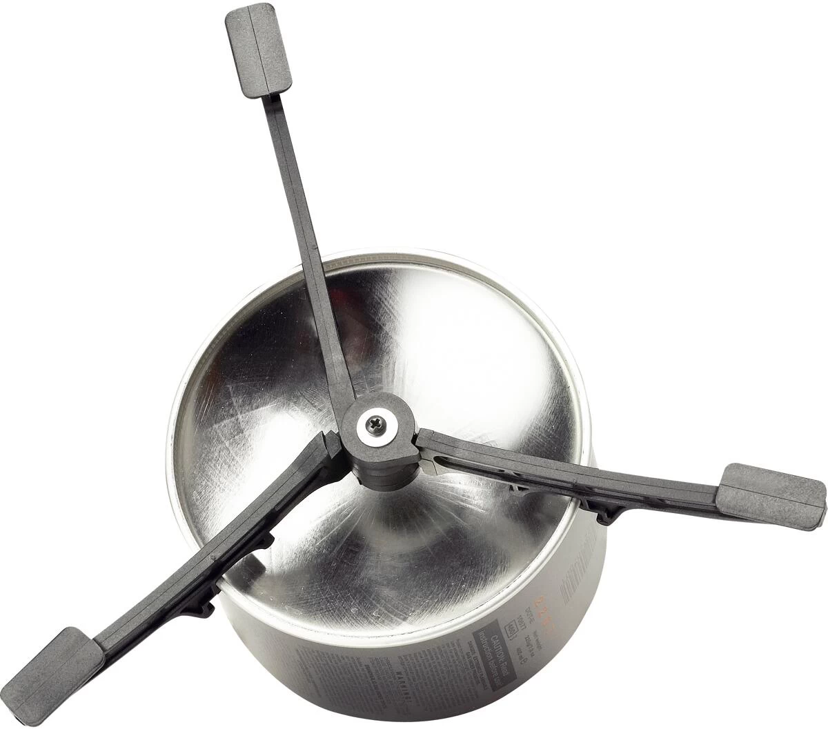 Praktischer Stützfuß für Gaskartuschenkocher. Wird einfach unter die Kartusche geklemmt (passt bei mehreren Marken) und erhöht so die Standfestigkeit bei der Kochernutzung erheblich. Für Kartuschendurchmesser von ca. 62 mm, 97 mm und 103 mm (jeweils oberhalb des gebördelten Randes gemessen). Klein zusammenlegbar.
