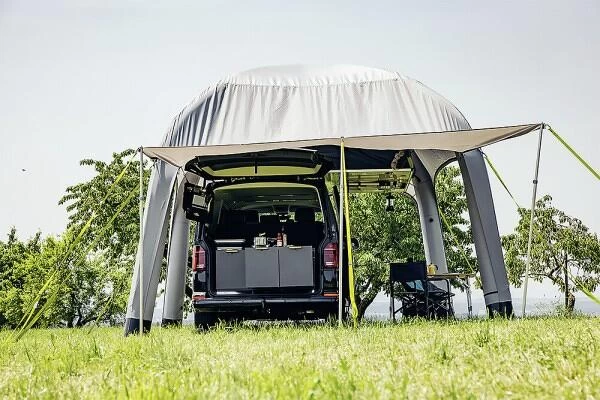 Das neue Dachzelt von Quipon ist einzigartig, da es Dachzelt, Vorzelt, Markise und Unterstellmöglichkeit in einem ist. Das aufblasbare Außenzelt ist über Gummizüge mit dem Innenzelt verbunden und kann als Unterstellmöglichkeit und Schutz für Campingequipment und z.B. Fahrräder verwendet werden.