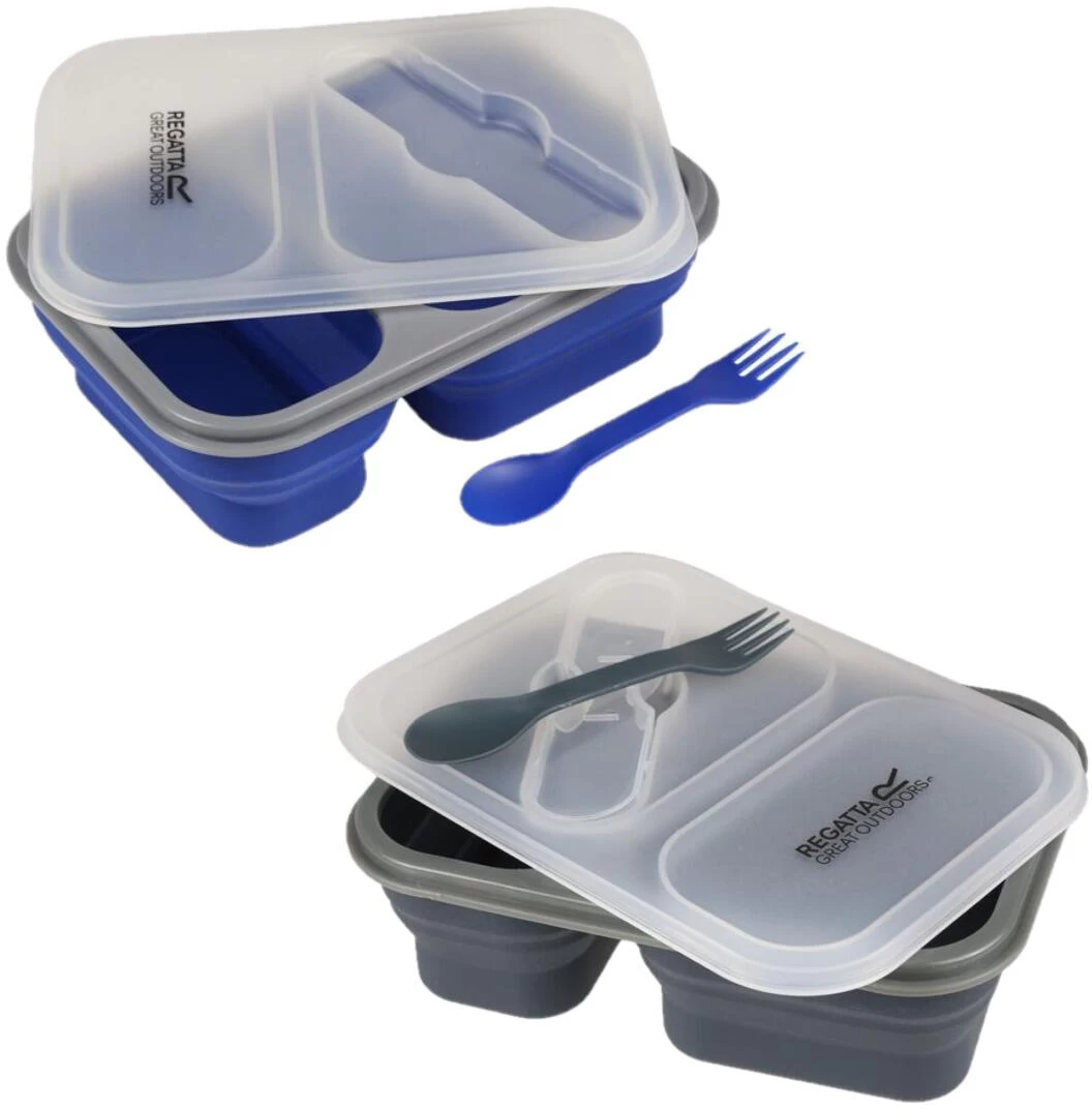 Regatta Silikon Lunchbox mit Deckel und zwei Fächer. Faltbar für ein kleines Packmaß, inklusive Göffel. Aus lebensmittelechtem Silikon hergestellt.