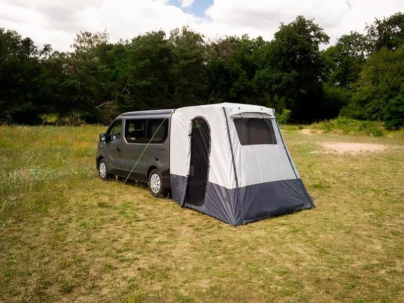 Kein Gestänge, geringes Packmaß, leichtes Gewicht und einfacher Aufbau machen das „Trapez Premium“ zum perfekten Heckzelt. Die neuen Austattungsmerkmale wie Moskitonetz in allen Ziptüren, Schürze zum Stoßfänger und eingenähte Bodenwanne bieten zusätzlichen Komfort. Die Fronttür hat ein zusätzliches Moskitonetz-Fenster und kann ebenso als Sonnensegel aufgestellt werden. Die beiden Seiteneingänge haben getönte Fenster mit Abbdeckung. Der Bestseller mit Schutz vor Moskitos und Insekten hat eine zusätzliche Lüftung über dem Eingang und kann mit Clips seitlich am Fahrzeug befestigt werden. Die eingenähte Bodenwanne kann mit Klett an der Stoßstange befestigt werden. Das Fenster im Dach ist als Oberlicht weiterhin nutzbar. Der große Innenraum eignet sich für ein Feldbett, Fahrräder, als Hundeplatz etc. und ist auch als Umkleidekabine oder Duschzelt verwendbar. Das Heckzelt wird einfach über die geöffnete Heckklappe gezogen und dann am Fahrzeug und Boden befestigt.