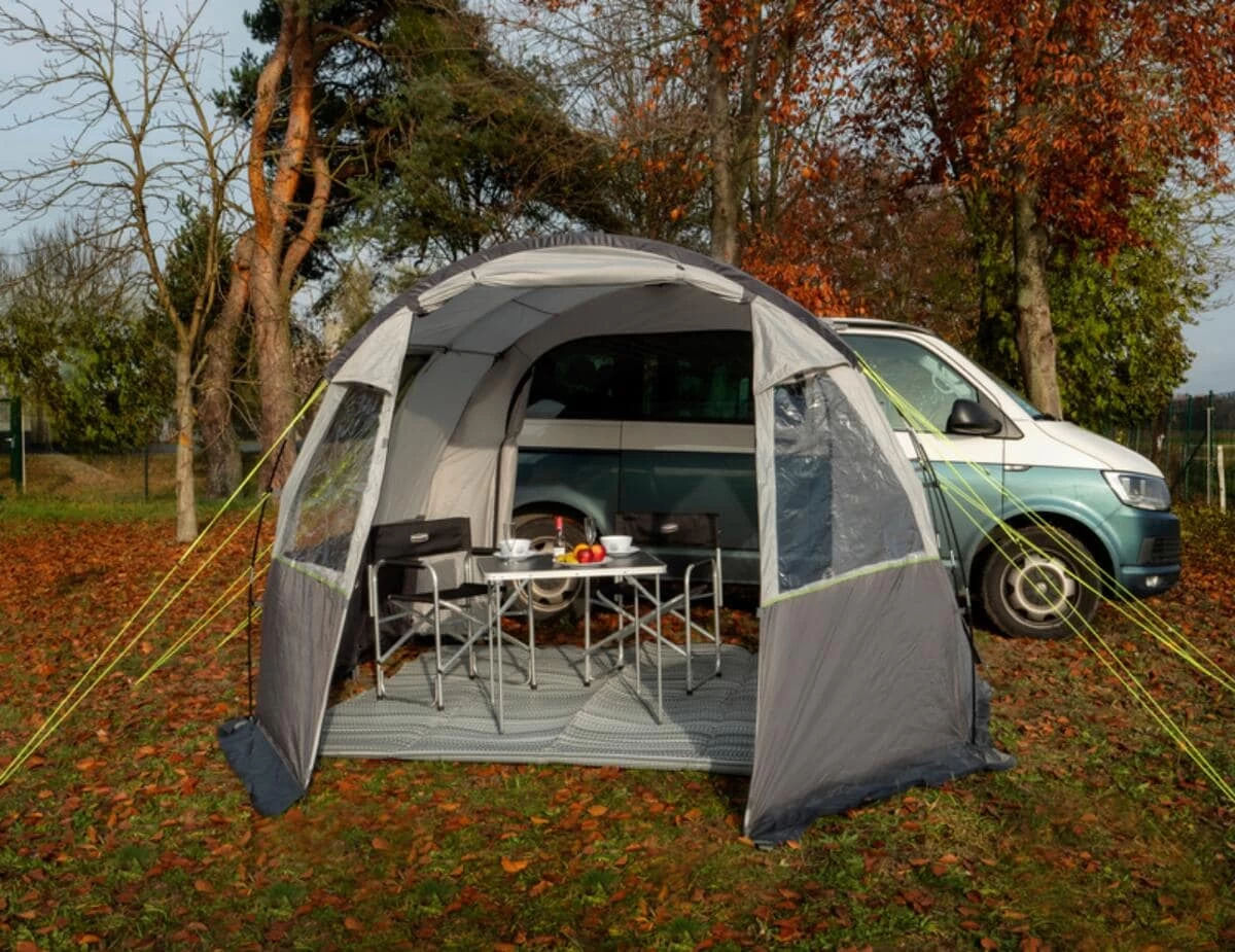 - Große Fronttür, die hochgerollt oder als Sonnensegel genutzt werden kann