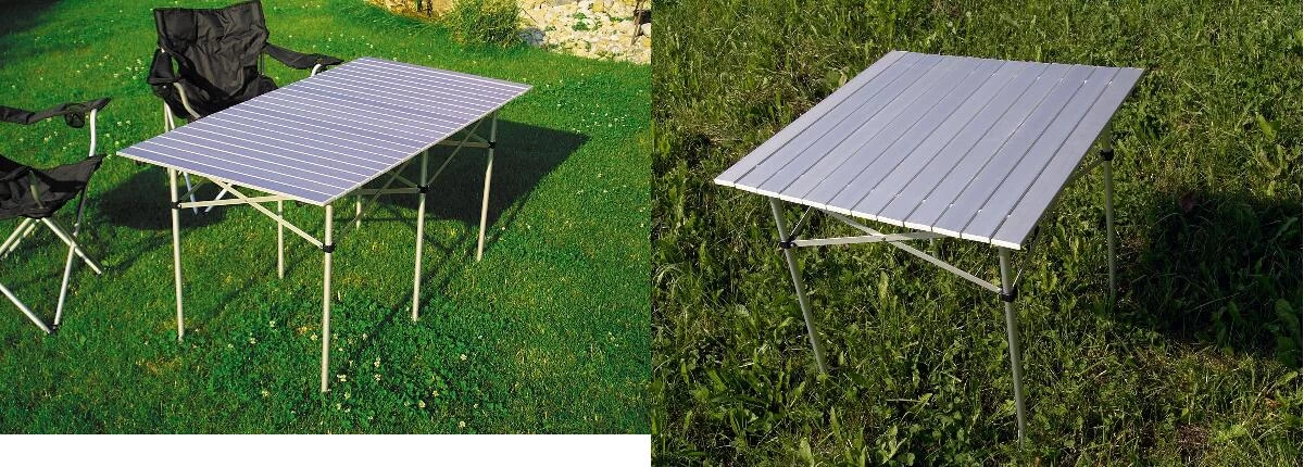 Die große Tafel für unterwegs. Wer etwas mehr Platz am Tisch möchte, ist hier richtig. Mit der Familie, Freunden oder Gästen hat hier jeder Platz. Der Tisch ist standfest, leicht zu pflegen, kann auch mal draußen stehen bleiben und sieht gut aus. Trotzdem mit viel Fußfreiheit, angemessenem, kleinem Packmaß und niedrigem Gewicht. 6 Füße mit ‚Scherenmechanismus‘, 2 Auflagestangen (2-teilig) mit Klippbefestigungen und Tischauflage aus Aluprofilen (mit Gummiband verbunden). Packsack schwarz, Gestell Alu natur.