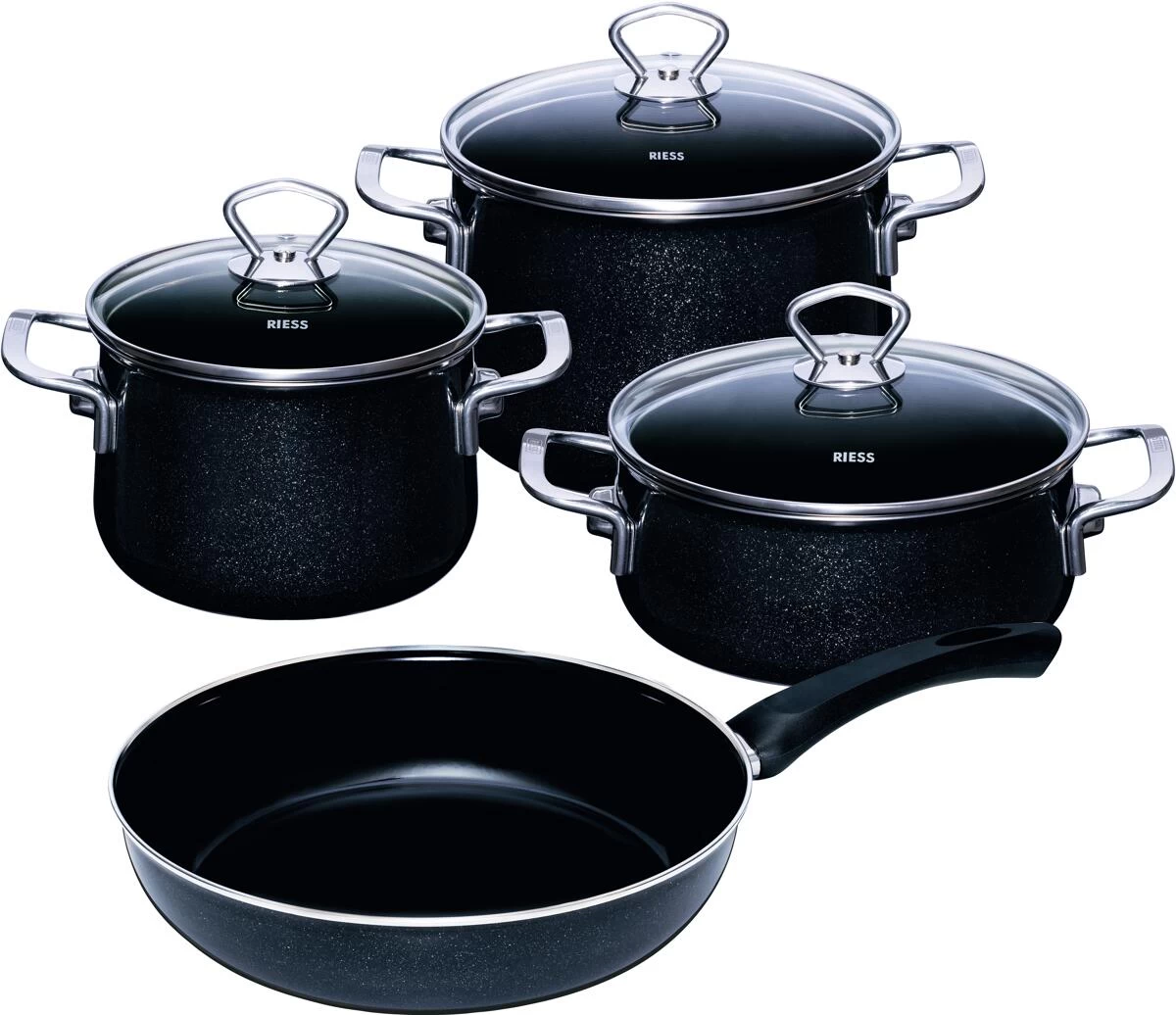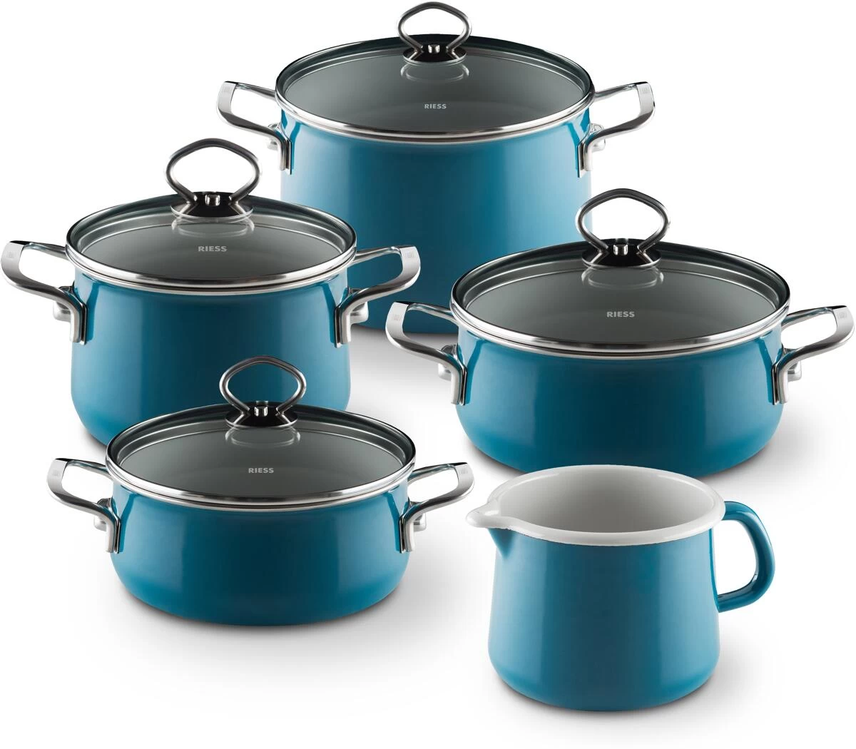 Die wunderschönen Produkte von Reiss werden mit großer sorgfalt und unter dem Aspekt der Nachhaltigkeit bereits in der 9. Generation hergestellt. Tradition und Handarbeit zeichnet die langlebigen Artikel aus. Dieses Topfset der Nouvelle Serie besticht durch modernes Design und einem spannenden Materialmix. Die Kasserollen und Kochtöpfe des Topfsets haben handlich geformte Edelstahlgriffe in modernem Design, die Pfanne einen ergonomischen Kunststoffgriff. Die Deckel der Kasserollen und Töpfe sind aus Glas und haben ebenfalls einen Edelstahlgriff. Der Stahl- Wärmespeicherboden sorgt dafür, dass sich die Wärme gleichmäßig und rasch verteilt. Dank der guten Wärmeleitung Emaille werden auch die Topfwände rundum warm, das spart Energie. Der robuste Chromrand verhindert das Abschlagen. Der Werkstoff Emaille besteht aus Eisen, das bei hohen Temperaturen mit Glas verschmolzen wurde, also aus natürlichen Rohstoffen. Bei sachgemäßem Gebrauch und richtiger Pflege macht Emaillegeschirr lange Freude und behält seinen typischen Glanz.