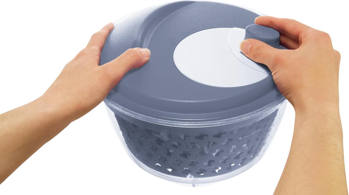 Diese Salatschleuder hat es in sich! Mit interessantem, ergonomischem Design, Antirutschfüsschen und leichtgängiger Kurbel ist sie der ideale Helfer für alle Salatfreunde, denn sie bietet trockenen Salat ohne Kraftaufwand. Die Schüssel wirkt ohne Sieb auch direkt auf dem Esstisch sehr anmutig. Das Volumen der Schüssel liegt bei ca. 4.5 Liter und beim Sieb bei ca. 3 Liter.