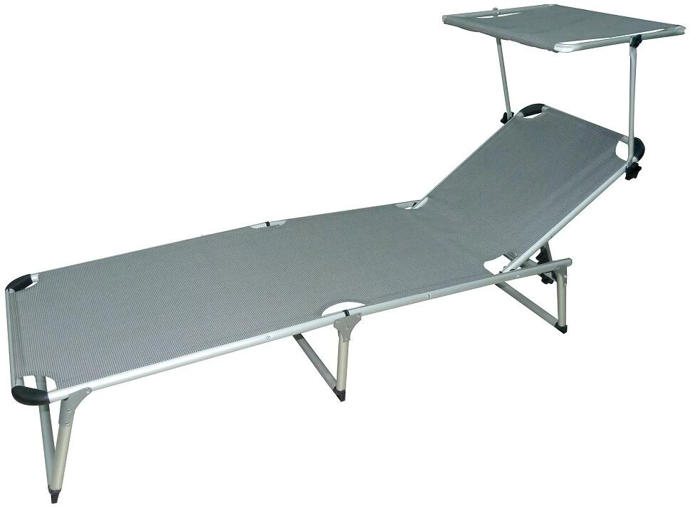 Wetterfeste, komfortable Liege mit stabilem Aluminium-Gestell aus wetterfester textilener Bespannung und Sonnenschutz.
