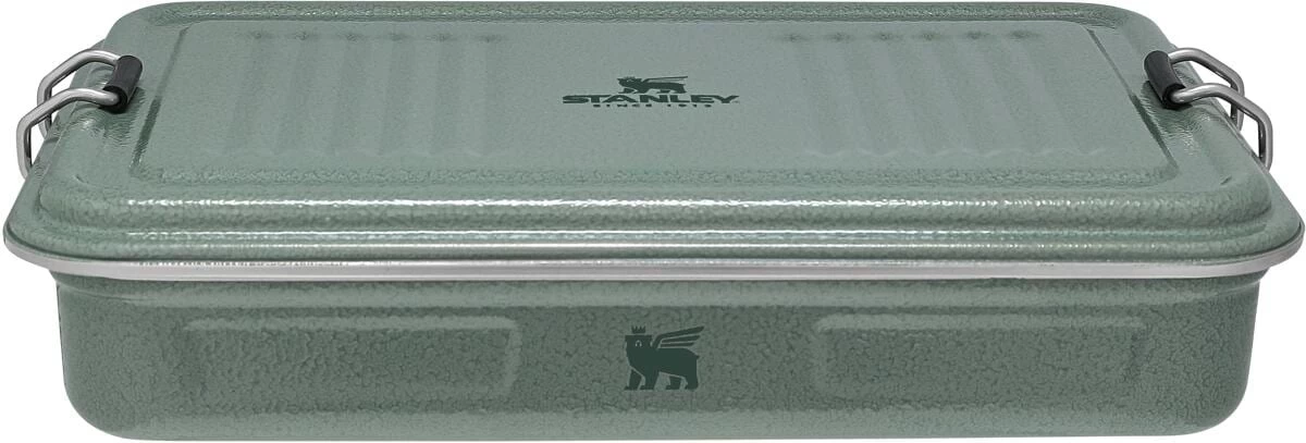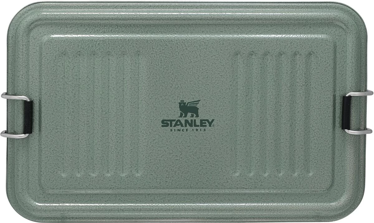 Die praktische Stanley THE USEFULL CLASSIC BOX in der Farbe Hammertone Green verdankt ihr zeitloses Design der 1950 entwickelten Lunchbox. Mit einem Fassungsvermögen von 1,1 Litern bietet diese Frühstückdose ausreichend Platz für die wichtigste Mahlzeit des Tages. Die Box wird aus rostfreiem 18/8 Edelstahl gefertigt und lässt sich durch zwei Verschluss-Schnallen sicher verschließen. Die Boxen können rutschsicher übereinander gestapelt werden, wodurch sie sich auch ideal als Vorratsdose eignen.