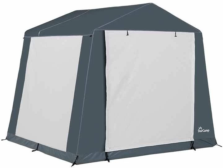 Dieses Gerätezelt wird komplett mit einer festen Bodenplane geliefert. Ausgestattet mit einem verstellbaren 4-Bein-Gestänge. Die Tür kann komplett aufgerollt werden, da sie zwei vertikale Reißverschlüsse an den Seiten und einen horizontalen Reißverschluss an der Unterseite hat.