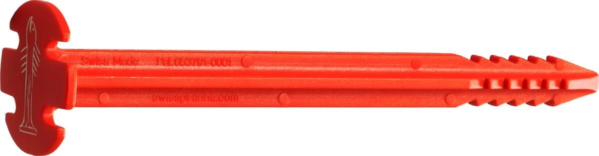 Der Hochleistungskunststoff PiranhaNT verzeiht das Einschlagen mit Hammer, Axt oder Stein – es entstehen keine scharfen Kanten, die das Zeltgewebe beschädigen. Da SwissPiranha-Zeltheringe im 90°-Winkel komplett im Boden versenkt werden, sinkt das Verletzungsrisiko gegen Null. Verschmutze Heringe lassen sich in der Spülmaschine reinigen. Auch in der Umweltfreundlichkeit punktet SwissPiranha: Die Herstellung liegt in der Schweiz und ihr Hochleistungskunststoff benötigt bis zu 13-mal weniger Energie als Heringe aus Aluminium.