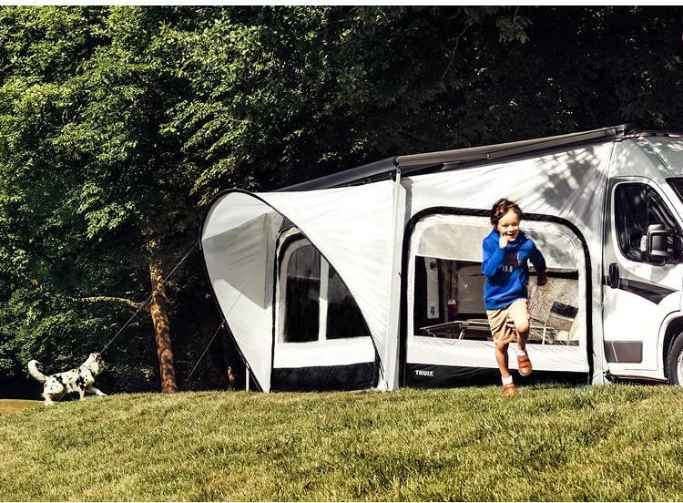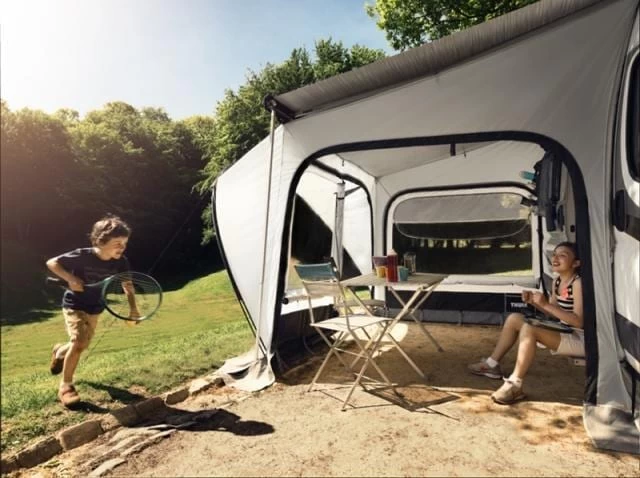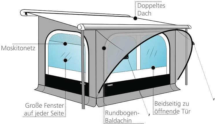 Ultraschneller Aufbau, in 15 Minuten ist es vollbracht! Leichtes Schutzzelt, das durch seine patentierte Konstruktion besonders einfach und schnell direkt unterhalb der Markise aufzubauen ist. Das Universal-Markisenvorzelt ist passend für die meisten Arten von Markisen. Für Markisen, die nicht mit Schienen ausgestattet sind, bestellen Sie bitte die entsprechende Thule Quickfit Markisenbefestigung.
