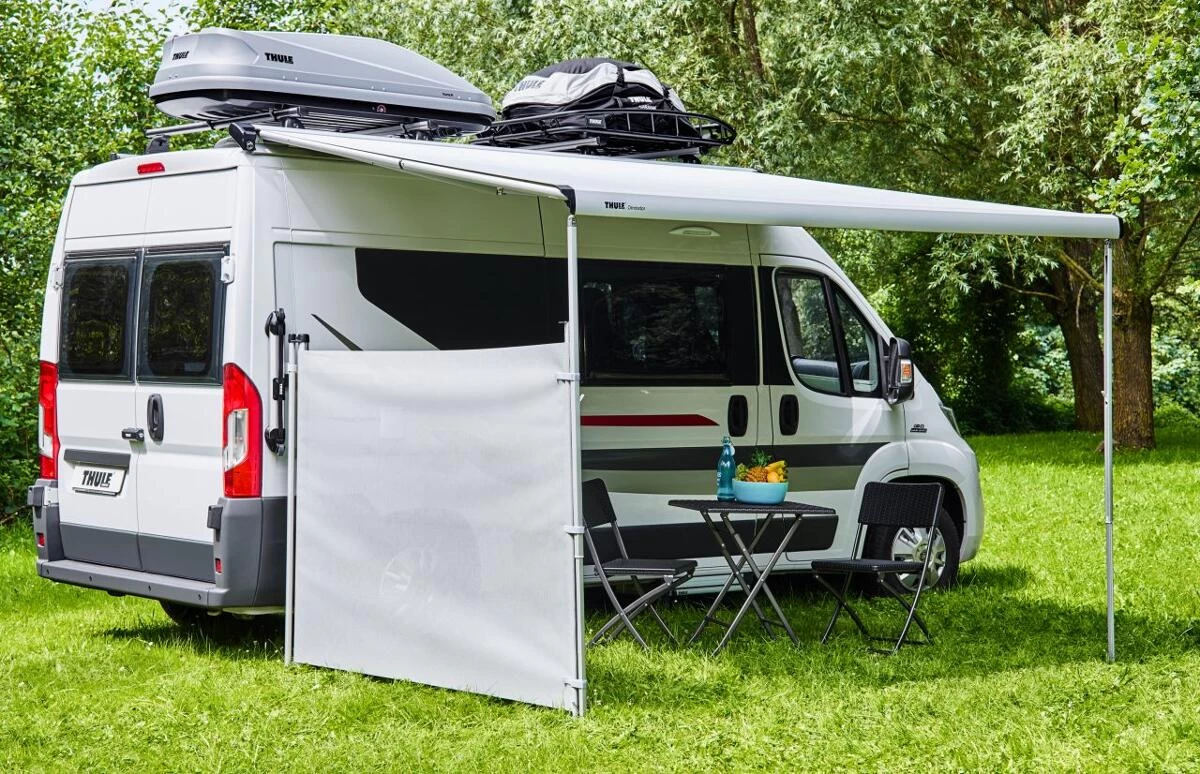 - Modulare Anbringung: Mann kann der Thule Windscreen an der Stützfuss-Wandehalterung oder an der keder-Schiene am Fahrzeug befestigen. Abrollen u. Am Stützfuss anbringen oder freistehend mit dem Abspann-Set aufstellen