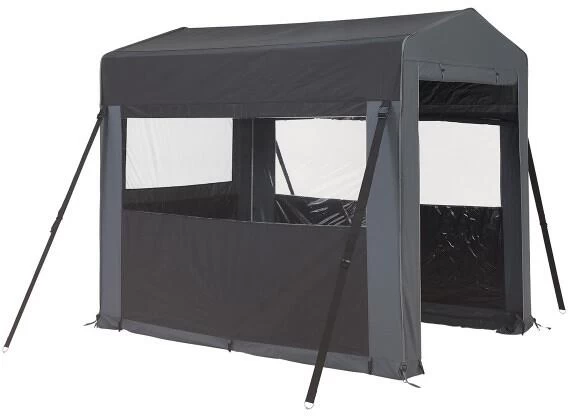 Dieses multifunktionale Lagerzelt ist ideal als Lagerraum oder Sommerküche. Das Zelt besteht aus Spanngurten, PVC-Fenstern mit Rollläden an den Seiten und einem Screen mit Rollläden auf der Rückseite. Der breite Eingang lässt sich leicht zusammenklappen/aufrollen. Die Höhe des Lagerzeltes beträgt am tiefsten Punkt 180cm und am First 205cm. Lieferung mit Tragetasche.