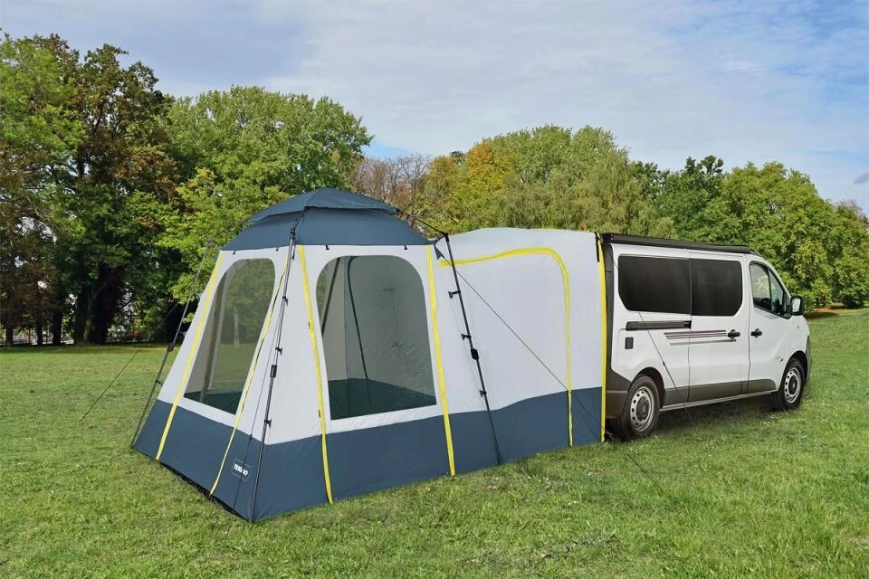 Mit dem Heckzelt SAPPORO stehen alle Reisen unter dem Zeichen von Komfort und Zweckmäßigkeit. Es ist innovativ und wurde konzipiert, um sich dem Heck anzupassen. Ein großer Pluspunkt ist das automatische Gestänge mit „Regenschirm“-Öffnung. Es ist freistehend, kann also vor Ort stehen bleiben, wenn Sie sich vom Stellplatz entfernen. Große Klarsichtfenster mit Innenklappen bieten außergewöhnliche Helligkeit. Dank seiner Tiefe von 400 cm ist es geräumig und bequem. Die Trennungstür zwischen der Luftschleuse und dem Wohnbereich bietet die Möglichkeit, zwei getrennte Räume zu schaffen. Dieses Heckzelt ist leicht und zugleich robust. Für Fahrzeuge mit einer Anschlusshöhe von 170 – 200 cm.