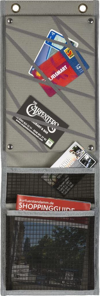 Flache Utensilientaschen, die der Planung und Organisation dienen. Die schmale Ausführung nimmt – wie eine Pin- oder Magnetwand – Dokumente aus Papier o. Ä. auf. Die große Variante besteht im oberen Bereich aus einem beschrift- und abwischbaren Memoboard. Im unteren Bereich sind beide mit Netztaschen ausgestattet.