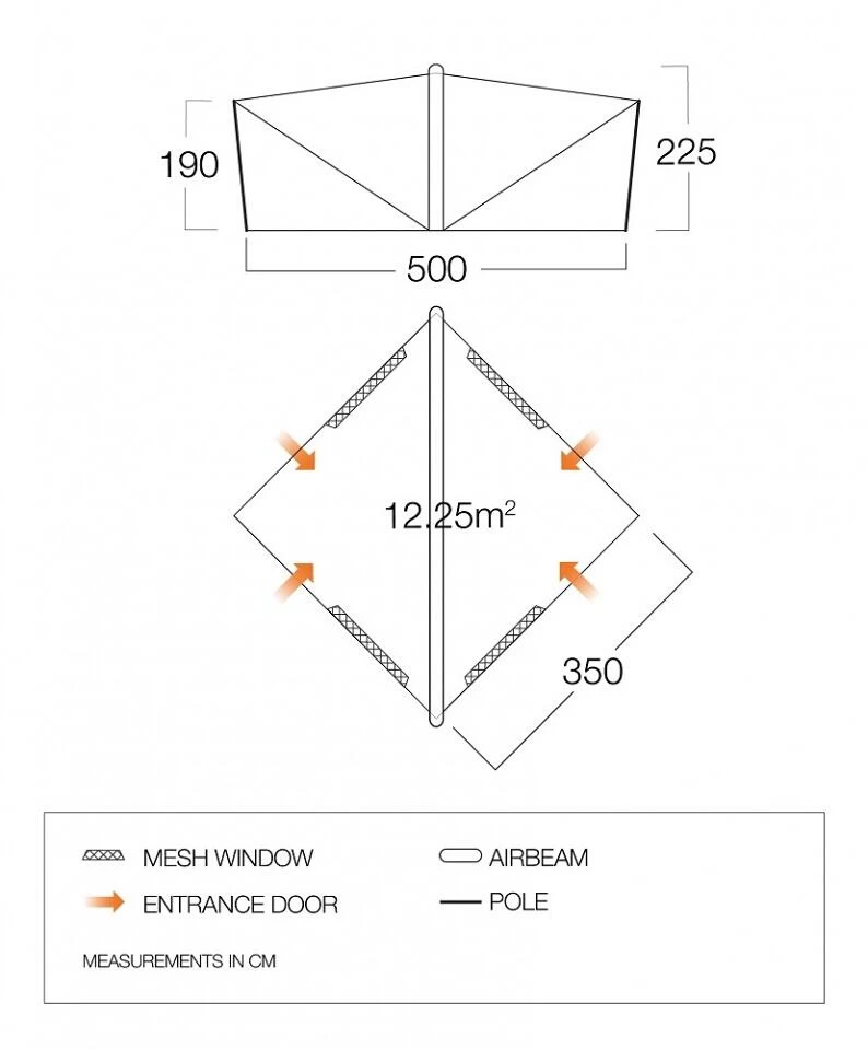 - Hybride AirBeam & King Pole Struktur – Erzeugt eine einzigartige Form, die schnell und einfach aufzustellen ist