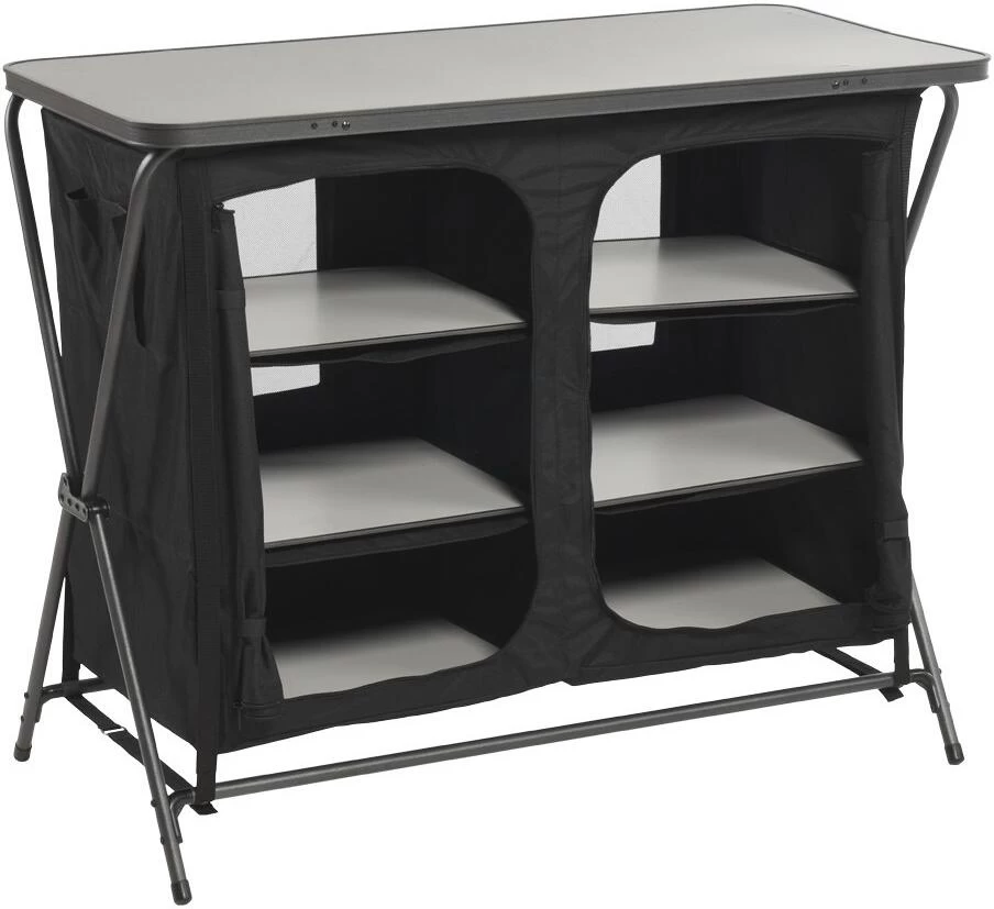 Campingschrank mit 4 Einlegeböden und Deckplatte. Schnelles Öffnen und Schließen durch einzigartiges Klappsystem. Die Einlegeböden werden herausgenommen, wenn der Schrank zusammengeklappt werden soll.