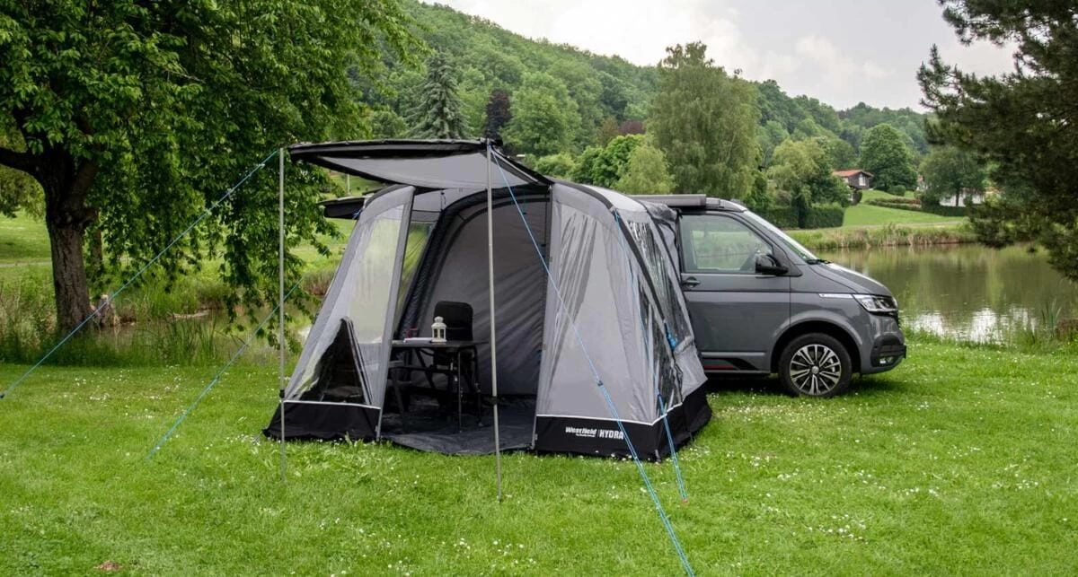 Das Luftvorzelt HYDRA 2022 für Bus oder Kastenwagen bietet durch seine veränderte Front-Luftschlauch-Form eine optimale Flächennutzung.